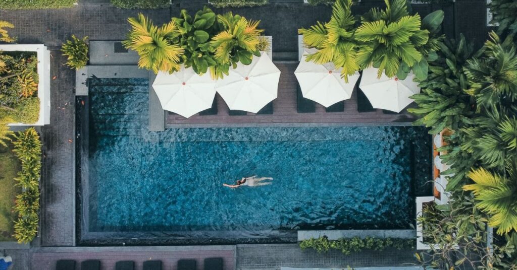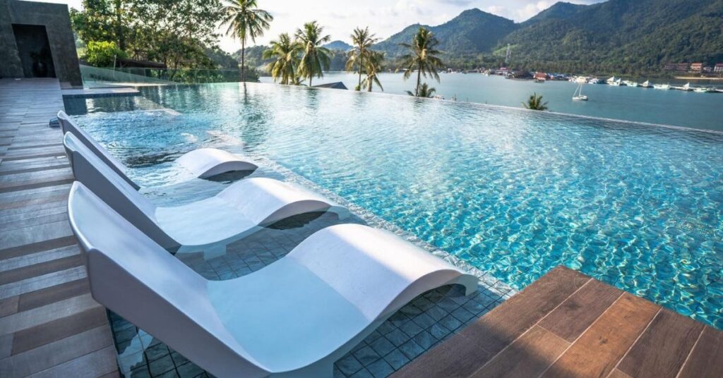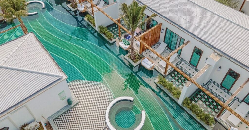 The color of your tile will decide the color of the water. White or light blue tiles result in a clear, bright turquoise water color, whereas dark blue or green tiles create a deep, moody, and reflective “lake-like” appearance.